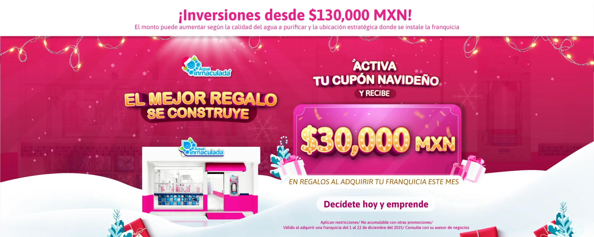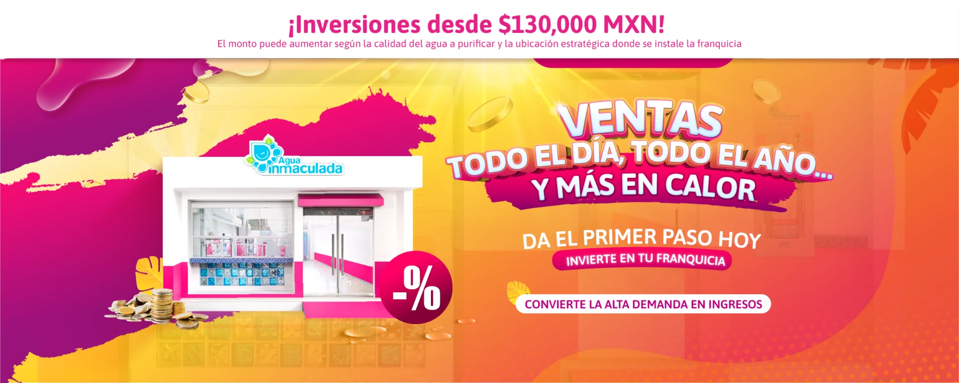 Tras 21 años de esfuerzo y dedicación, en Agua Inmaculada hemos logrado posicionarnos como la franquicia #1 en fabricación, distribución e instalación de equipos para plantas purificadoras de agua, ofreciendo así la mejor oportunidad de negocio y superación económica a miles de personas que están en busca de una mejor vida en todo México, Centro y algunos países de Sudamérica como Panamá, Colombia, Perú y Brasil. Convirtiéndonos en una franquicia internacional.
